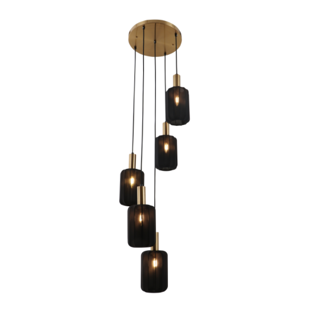 Висулката на силно осветление показва пет барабанни черни нюанси на коприна, окачени на постепени височини от 50-сантиметрова кръгла тавана. Всеки нюанс може да се регулира индивидуално чрез медно фини вериги, което позволява гъвкави конфигурации за маси, острови или високи тавани.