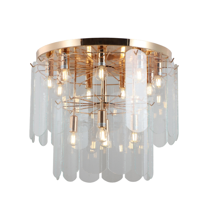 Този силен осветителен луксозен луксозен двустепенно златно флъш монтиран монтаж може перфектно да съответства на всяко пространство, добавяйки нотка на елегантност и романтика в стаята ви и да се превърне в визуален фокус на цялото пространство.