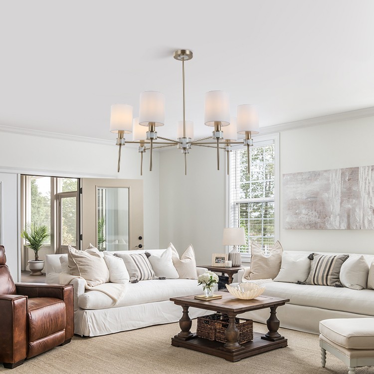Този месингов висящ полилей със силно осветление и много светлини със силно осветление от китайската OEM фабрика с мръснобял цилиндричен текстилен абажур с елегантен дизайн и мека светлина е идеален за окачване в центъра на всекидневната, трапезарията или спалнята. Окачането на този полилей над масата за хранене може да добави нотка изтънченост и елегантност към обстановката за хранене. Когато вие и вашето семейство или приятели се съберете, за да се насладите на храна, меката светлина, излъчвана от полилея, може да създаде топла и романтична атмосфера за хранене, което ви позволява да се насладите на храната и да се насладите на времето за хранене в спокойна и приятна среда. Ако инсталирате този мръснобял цилиндричен месингов абажур от плат Multi-Lights в спалнята, неговата мека светлина и елегантен дизайн могат да създадат спокойна и комфортна атмосфера, помагайки ви да се отпуснете и да заспите по-лесно. В същото време може да служи и като декоративен акцент в хола, подобрявайки красотата и цялостния стил на пространството.