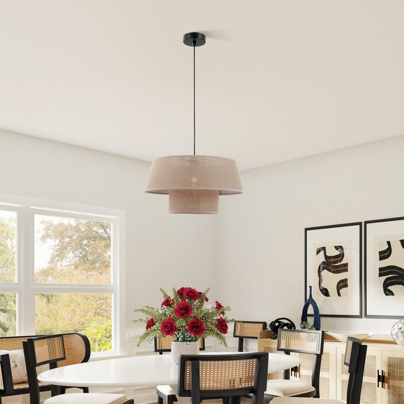 Наскоро представена от китайския производител Strong Lighting, двуетажната конопена кухненска висяща лампа внася ретро и уютни вибрации в интериорната декорация. Гъвкав черен кабел с дължина 1M позволява свободно регулиране на височината на лампата и използването й като висяща лампа или полувградено осветително тяло. Можете да го окачите над масата за хранене, да го поставите в ъгъла на хола или дори да го окачите в спалнята. Това не е функционален продукт, а част от декорацията във вашия дом. Кухненската висулка от коноп на две нива има два различни размера, друг по-малък с диаметър 300 мм.